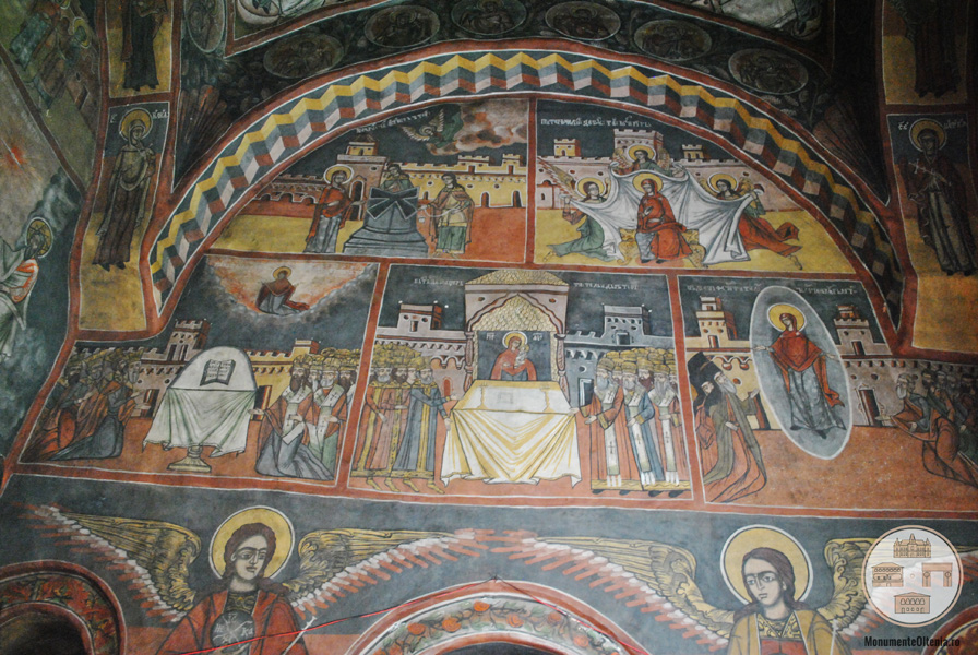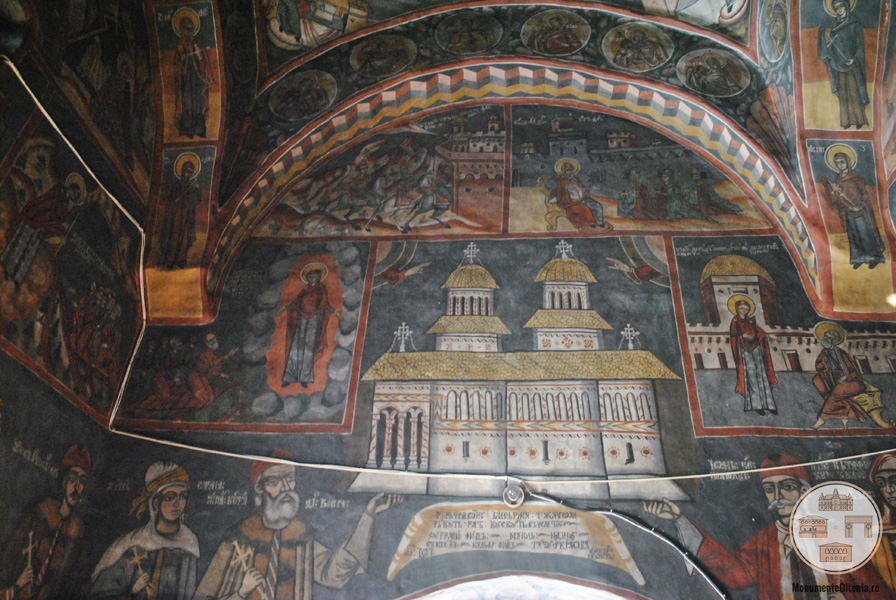 În interiorul bisericii, la dreapta intrării, sunt zugrăviți Jupân Costandin Kovrea, și lângă el “Jupan Stana”. La stânga: “Ioan vel vstr. vataful plaiului Hurezului”; lângă el “maica sa Nedelea”. Pe peretele de sud: „Jup. Stanciu san ego Jupa Maria, Jupan Ioan San Zanfir Măldărescu, Jupana Stanca”. Pe icoane apar inscripțiile “Marin zugravu 1858”, “anul 1858 Martie 20”, “Această iconă e zugrăvită de domnu Iancu Dumitriu, hot Târgu Hurezu la anul 1858 Mai 31 Marin zugravu”, “1850 Octombrie 7 Ioan zograf Coltescu”. Pe o cruce lucrată admirabil în filigram: “Ioanike Arhimandrit anu 1848”. La intrare, înăuntru “Întărește Doamne Biserica … zugravi fiind Manolea i Dinu ot Craiova calafe (sic) fiind Stanciu ot Craiova, Dumitrașco i Dumitru leat 1807”.