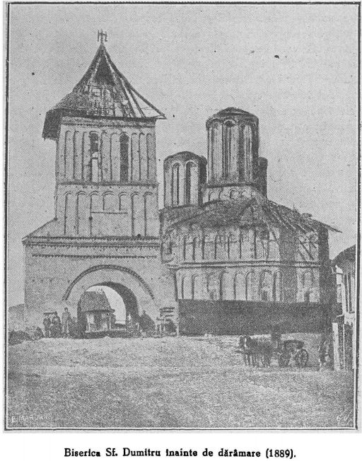 Începutul secolului al XIX-lea găsește Biserica Sf. Dumitru în plin proces de degradare, pus pe seama unei proaste administrări a fondurilor, moșiilor și proprietăților. În acest context, lăcașul își pierde statutul de biserică episcopală în favoarea Bisericii Madona Dudu. Lovitura de grație vine odată cu cutremurul din 1838, în urma căruia biserica aproape se prăbușește (crapă zidul de la altar, cad cărămizi din turlă etc). Începând cu anul 1849, biserica se închide din cauza stării avansate de deteriorare. Deși au existat numeroase încercări de reparare a bisericii (în 1858 domnitorul Alexandru Dimitrie Ghica bate medalie pentru a strânge fonduri pentru rezidirea bisericii, în 1861 Cezar Boliac trimite un raport despre starea bisericii Ministerului Cultelor), aceasta rămâne închisă vreme de 40 de ani, timp în care este împrejmuită cu un brâu de fier pentru a nu se prăbuși.